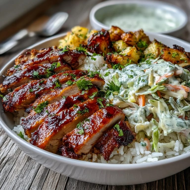 - Slice the glazed chicken into strips and divide your fluffy rice among four bowls. Top each with sliced chicken, a generous portion of roasted vegetables, and a scoop of coleslaw, then drizzle everything with extra BBQ sauce if you want to push the flavor even further.