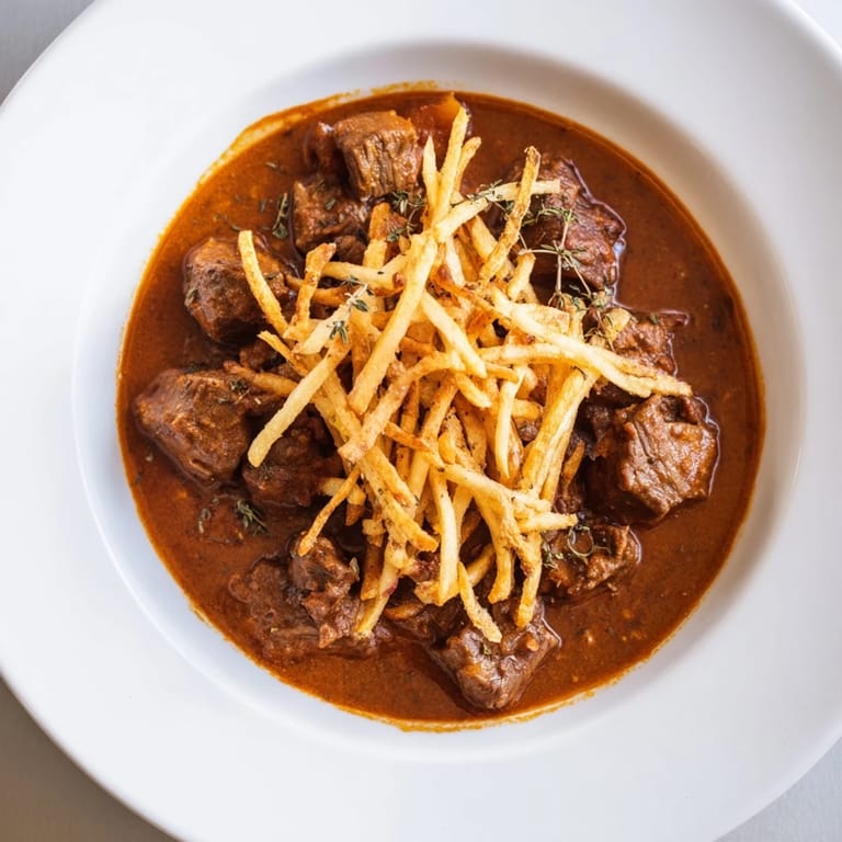 Pin It I discovered Czech goulash on a cold Prague evening, sitting in a small restaurant where the kitchen's warmth seemed to radiate through the dining room. The first spoonful was revelatory—tender beef swimming in a deep paprika sauce that tasted like it had been simmering for generations, crowned with golden fried potato strips that crackled between my teeth. I spent the next hour trying to decode those flavors, knowing I had to recreate it at home. What started as curiosity became an obsession, then eventually, a dish I'd make for anyone willing to sit at my table.