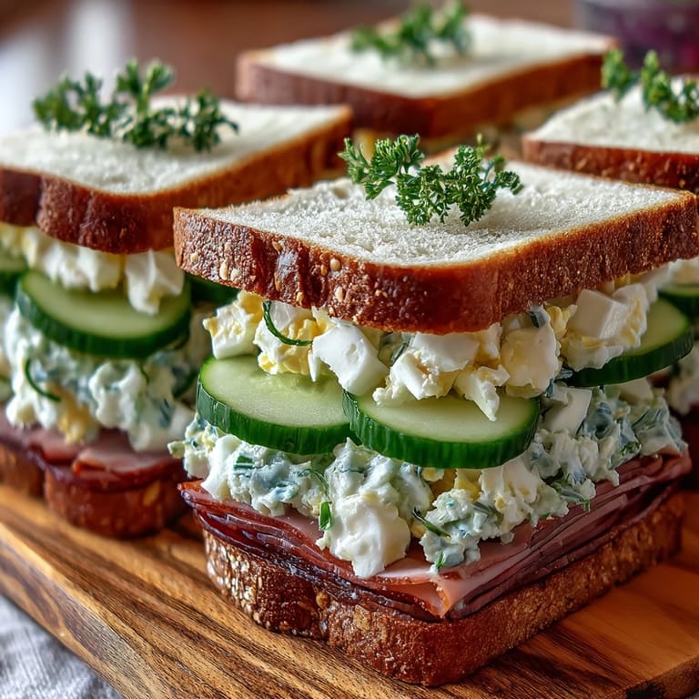 This recipe welcomes creative adaptations while maintaining its elegant character. For the cucumber sandwiches, add a touch of lemon zest to the cream cheese mixture for brightness, or substitute watercress for a peppery note. The egg salad can be enhanced with a pinch of paprika or curry powder for warmth. For the ham sandwiches, try prosciutto or smoked turkey as alternatives, or swap honey mustard for fig jam for a sweet-savory contrast. Use gluten-free bread to accommodate dietary restrictions, or opt for all white bread if you prefer uniformity. Add thinly sliced radishes to the cucumber sandwiches for color and crunch, or incorporate finely minced celery into the egg salad for extra texture.