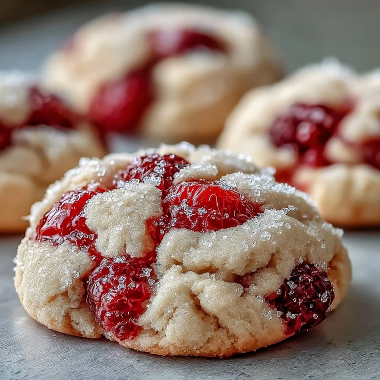 Pin It My daughter walked into the kitchen one Saturday morning holding a pint of raspberries and asked if we could make something special. I had just pulled butter from the fridge, planning regular sugar cookies, but her hopeful face changed everything. We folded those berries in gently, rolled the dough in sparkly pink sugar, and watched them bake into something far better than I'd imagined. The house smelled like vanilla and warm fruit, and she hasn't stopped requesting them since.