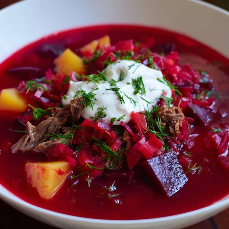 Pin It My grandmother's kitchen always smelled like beets when autumn arrived—that earthy, almost sweet perfume that seemed to seep into every corner for weeks. She'd make this borscht on days when the weather turned unpredictable, when you could feel winter circling just beyond the windows. The first time I actually watched her make it, I was surprised how much she fussed over the beef, skimming the broth like she was polishing silver, and how the vegetables transformed from raw, humble things into this jewel-toned medley that made the whole pot shimmer. Now I understand: that patient attention is what turns simple ingredients into something that tastes like comfort and history in a single spoonful.