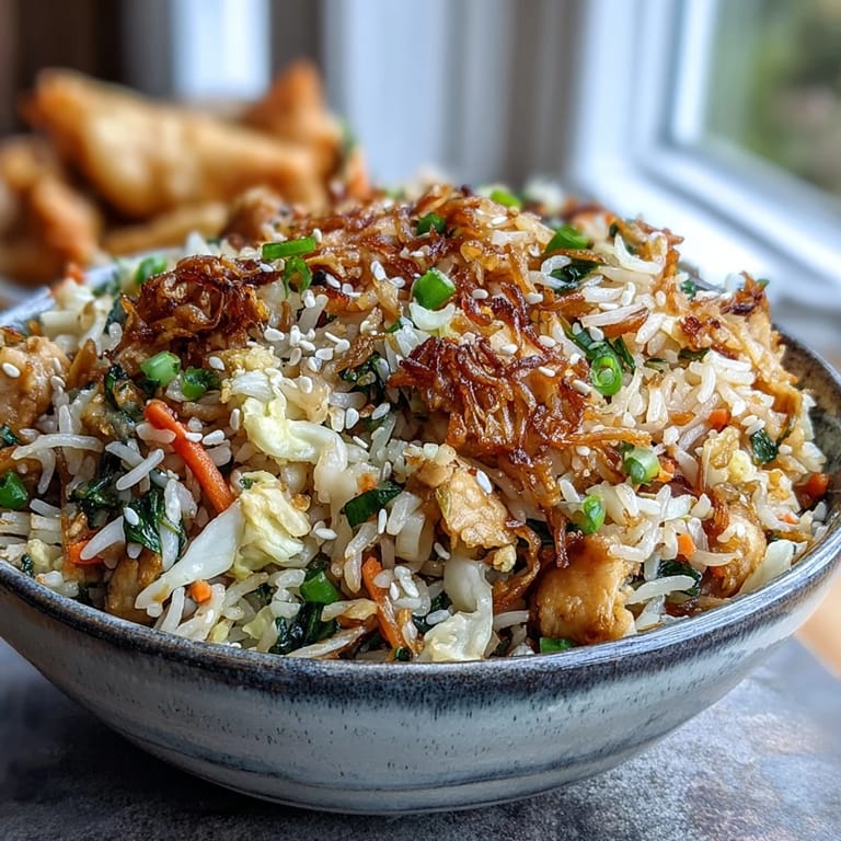 Pin It My neighbor showed up at my door one evening with a container of egg roll filling she'd made too much of, and instead of wrapping it all night, I had a wild idea: what if I just tossed it into fried rice? Twenty minutes later, I had something that tasted like the best parts of an egg roll without any of the frying mess, and she's been asking me to make it ever since.