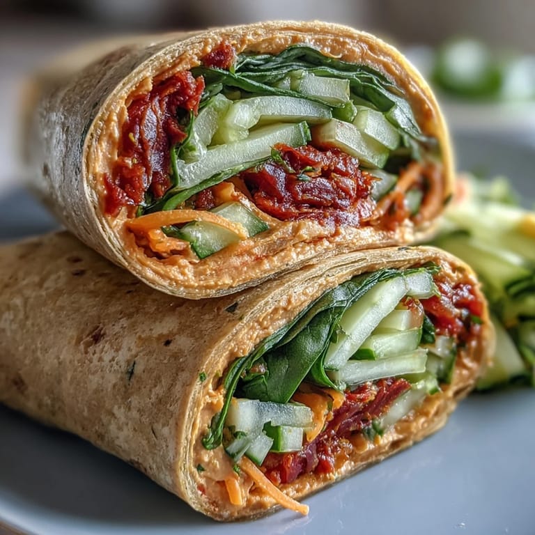 Pin It Last summer, I was hunting for something I could grab on my way out the door that didn't feel like I was sacrificing flavor for convenience. I'd been obsessed with sun-dried tomatoes all season—their concentrated sweetness and slight tang felt like bottled sunshine—and one afternoon, I stirred them into hummus almost by accident, just to see what would happen. The result was so velvety and alive that I immediately started wrapping it up with whatever crisp vegetables I had on hand. These wraps became my go-to lunch, the kind of thing that actually made me excited to eat lunch instead of just tolerating it.